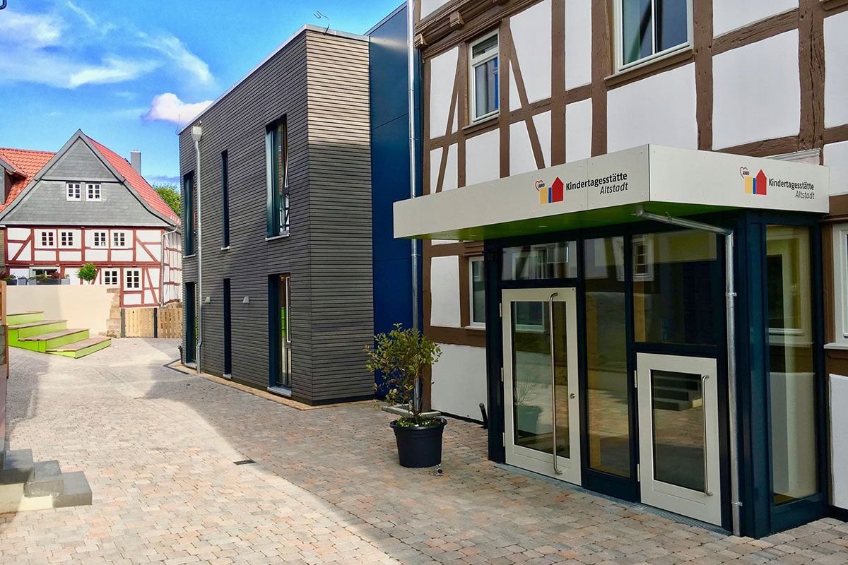Unsere KiTa Altstadt im Herzen der Reformationsstadt Homberg/Efze wurde im September 2017 eröffnet. Das Gebäude ist eine Kombination aus der alten Fachwerkscheune „Landesfeind“ und einem modernen Anbau. So entsteht eine Wohlfühlatmosphäre, in der die Kinder mit Freude spielen. Auch die Außenanlage bietet viele Möglichkeiten zum Toben.